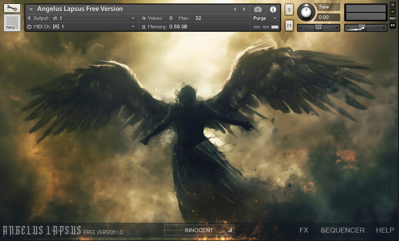 Corrupted Angelus Glockenspiel. Sampled from a cheap children's Angelus Glockenspiel, and transformed into something otherworldy. Each note has three round robins over three velocity layers, and six sample modes (in the free version, only three of the six sample banks are available). Angelus Lapsus also features an XY Pad, allowing two of eight FX selections to be mixed together, as well as it's own bespoke Sequencer/Arpeggiator.
