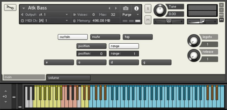 Each string was developed as separate patch (included) and then compiled into one, select-able or in combination. I’ve not the time to develop automatic range so there’s rather a lot of keyswitches to access positions 0 – 11 (in yellow). Alternatively two range switches (again in yellow) that give an optimal lower or higher range shown page 3 of ‘Atk Bass – About.pdf’ are sufficient for many cases.