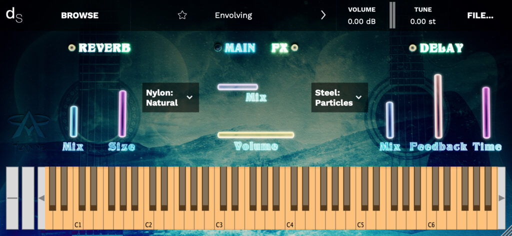The result is a cinematic instrument that combines processed pad textures with natural acoustic guitar samples. It includes both nylon and steel guitars, each with three modes: