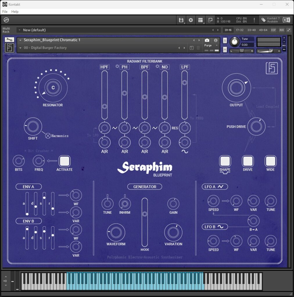 Seraphim Blueprint is a lightweight instrument designed in Kontakt 6.8. It uses wavetable synthesis and chromatic resonators.